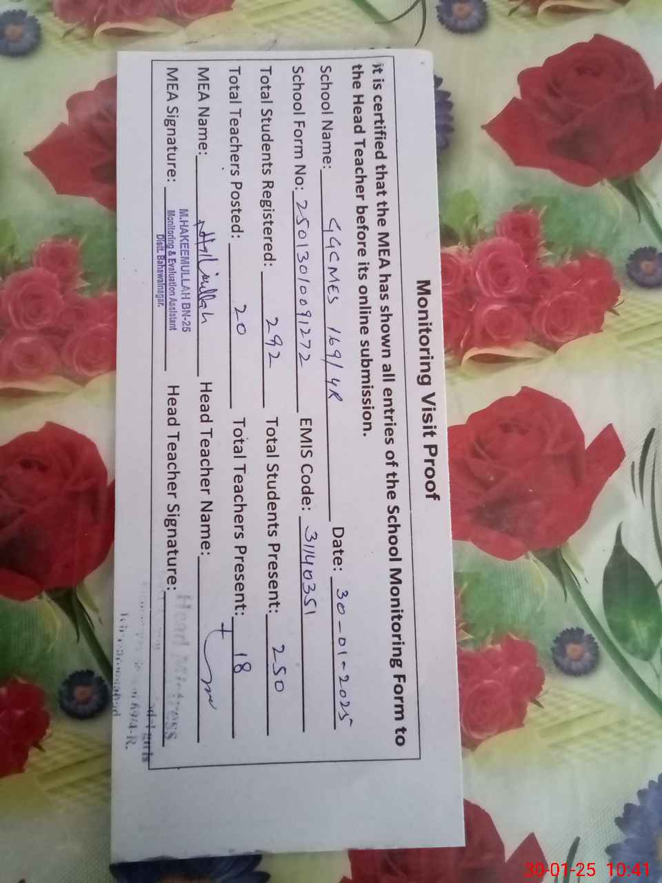 | Certified that this School was Inspected by the Undersigned MEA/DMO Today and the Information Stated Above is as Per Record. | |||||