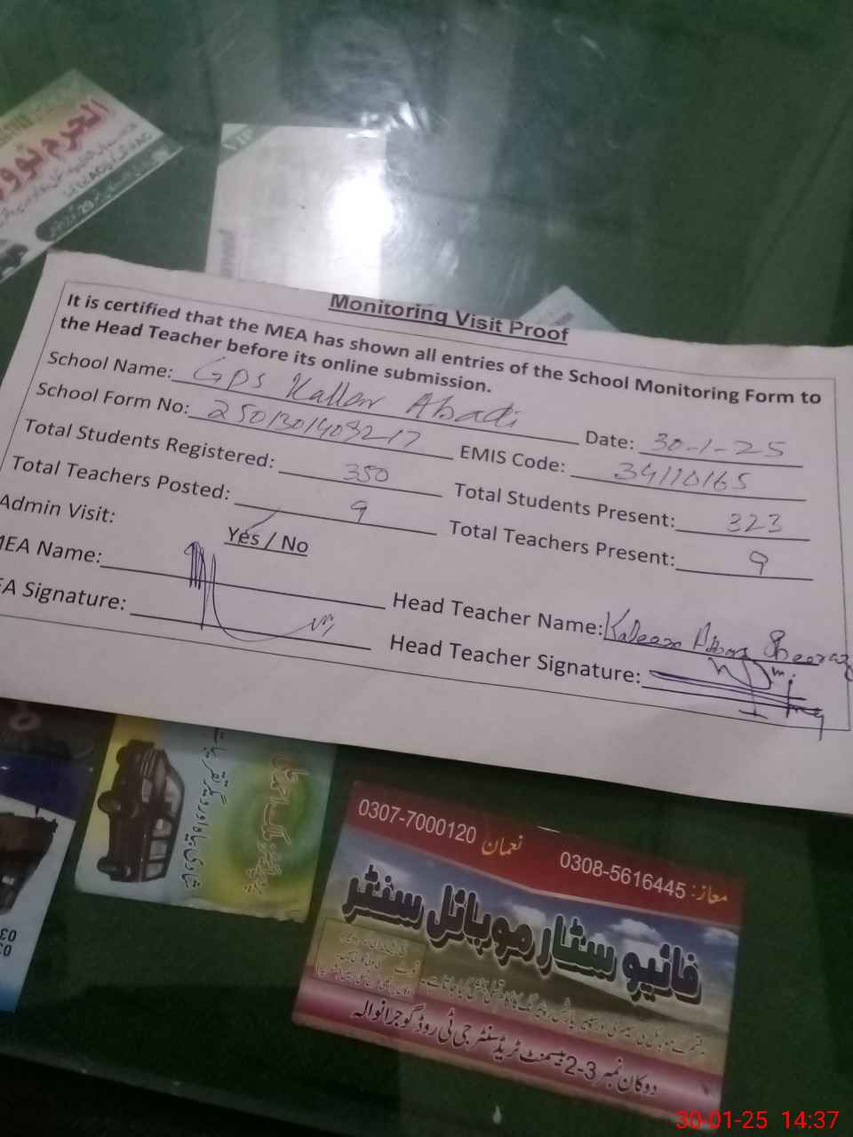 | Name: Ka**** Ab**** Designation: (School Headmaster's/Headmistress's) PST Phone/Cell Number: 03**** |