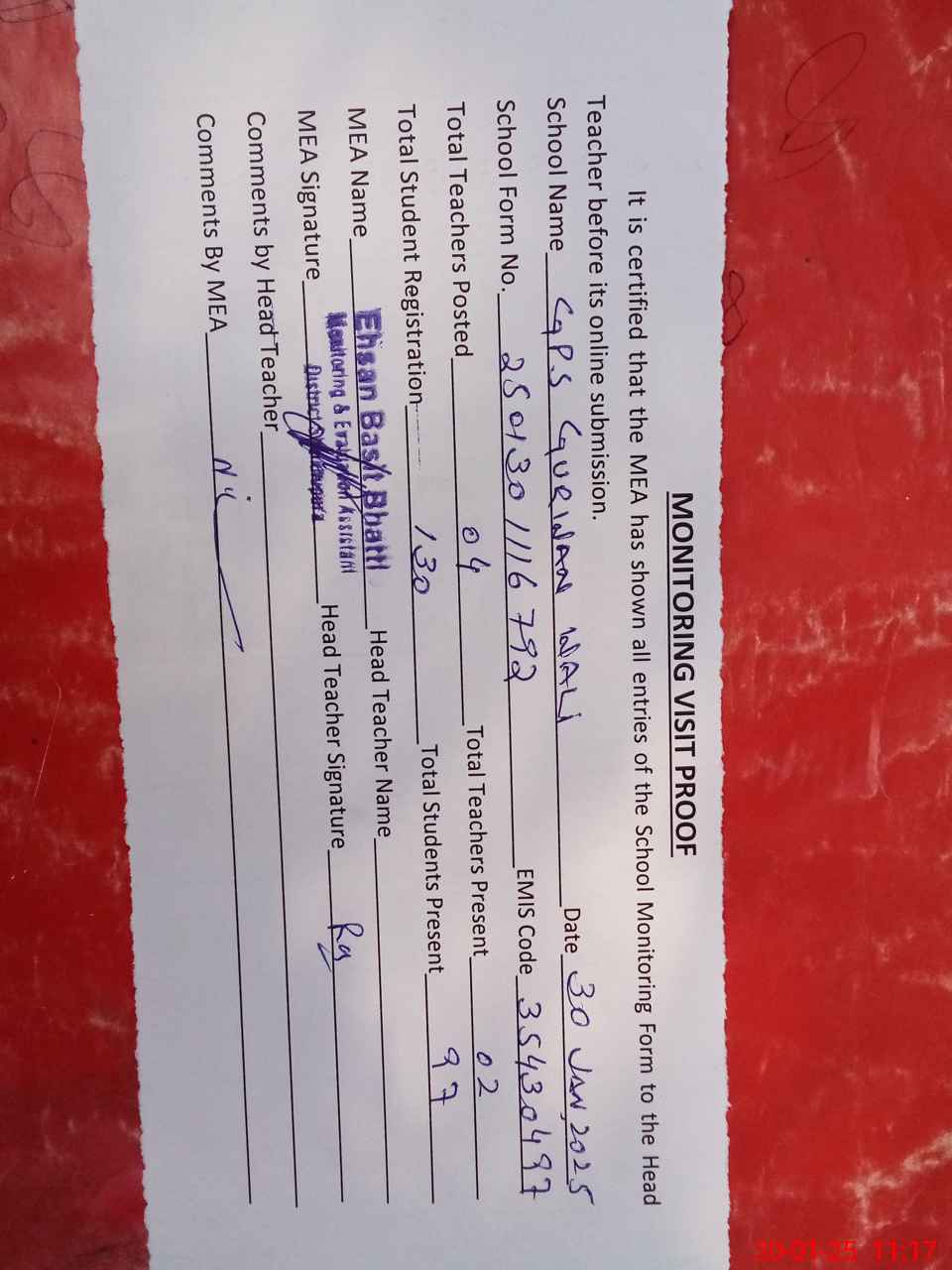 | Attendance Register | Head Teacher | MEA with School | Visit Proof |