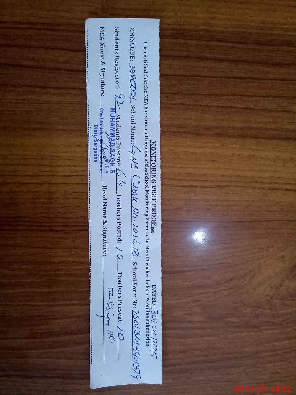 | EMIS Code: 38420001 | Name of School: GHS CHAK NO.101 SB | |||