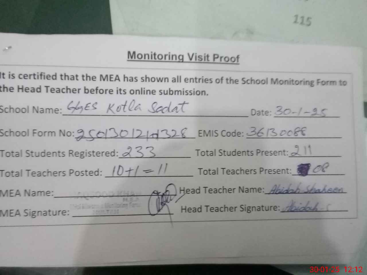 | Attendance Register | Head Teacher | MEA with School | Visit Proof |