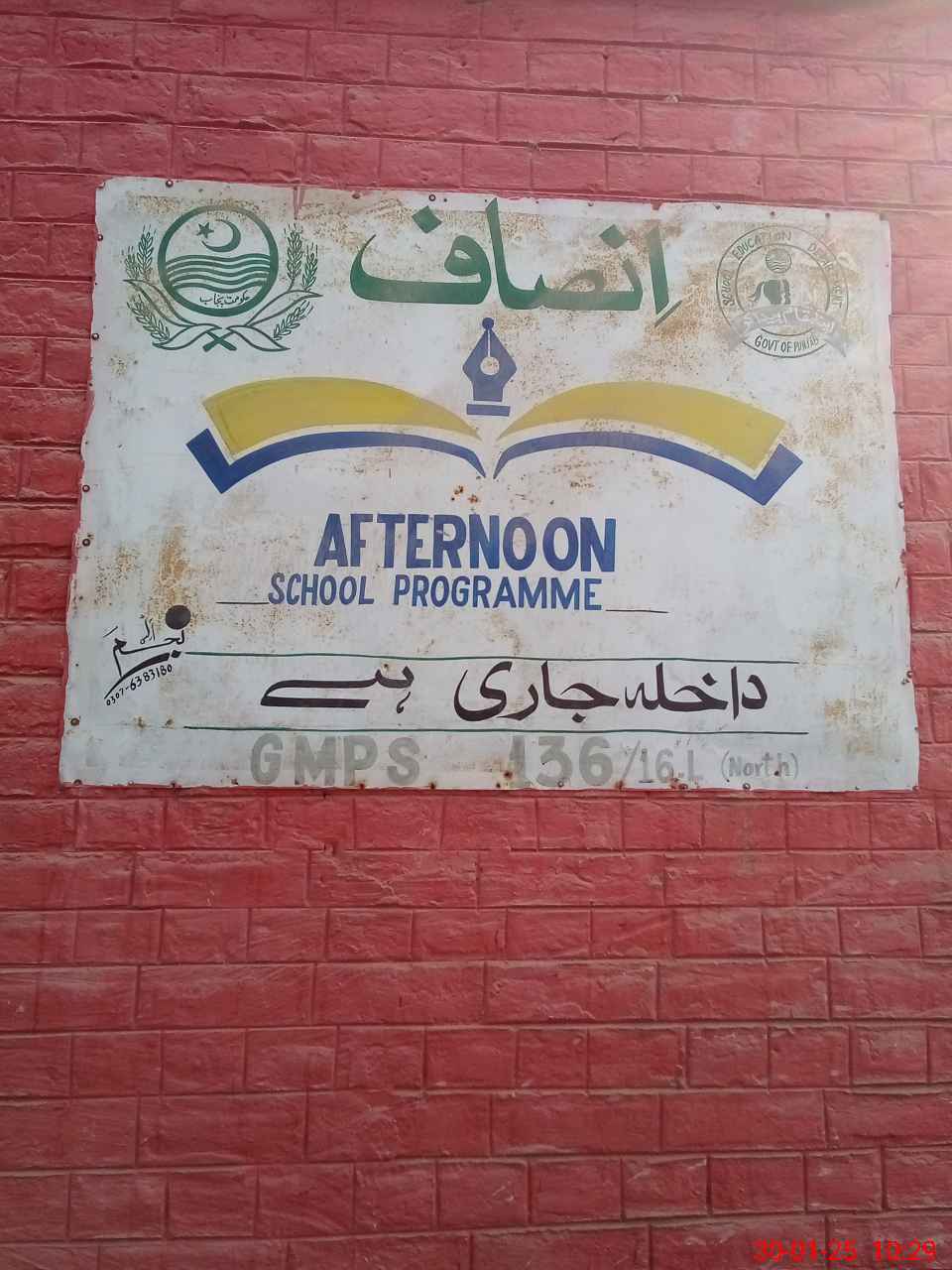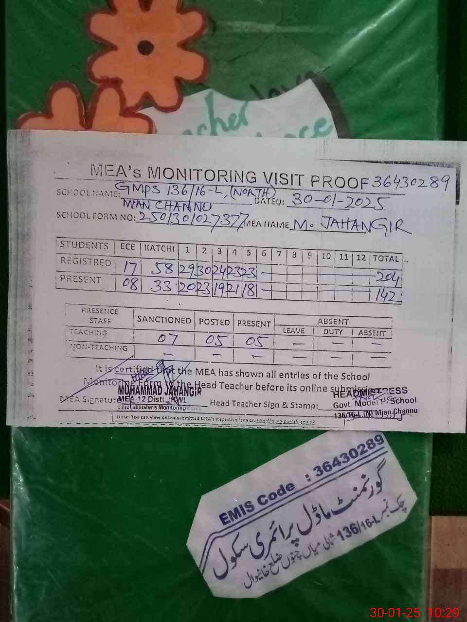 | EMIS Code: 36430289 | Name of School: GMPS 136/16-L NORTH, P/O 135/16-L STUNTZABAD, MIAN CHANNU | |||