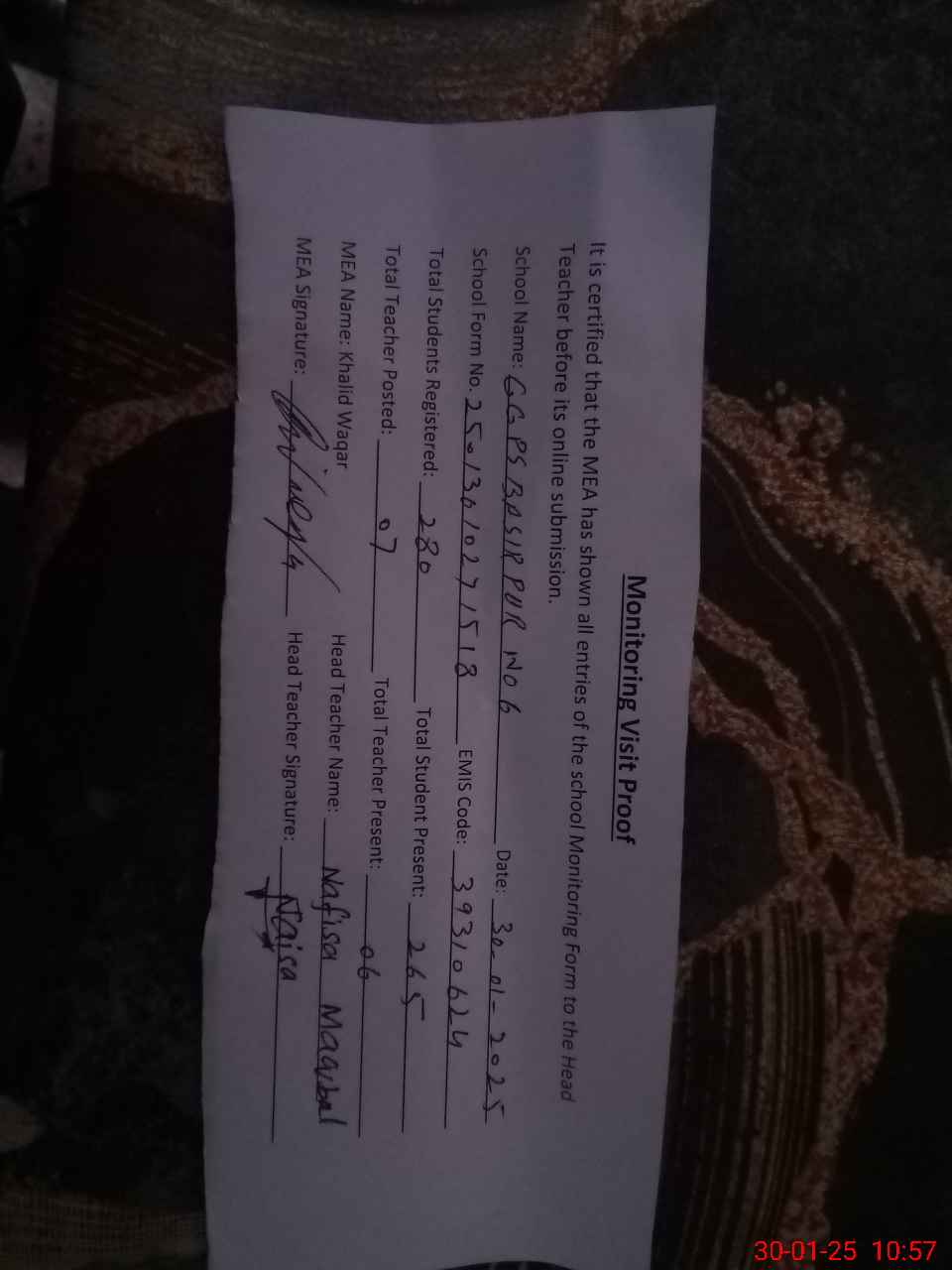 | EMIS Code: 39310624 | Name of School: GGPS BASIR PUR NO 6 | |||