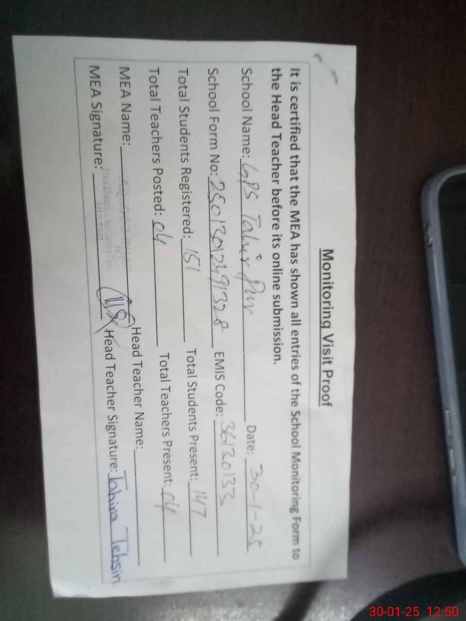 | Attendance Register | Head Teacher | MEA with School | Visit Proof |