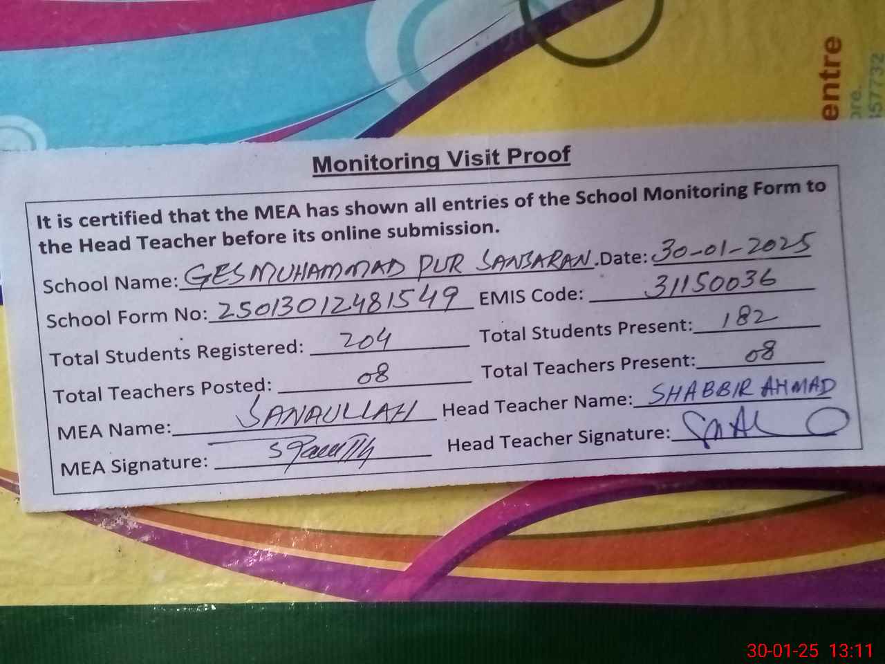 | Attendance Register | Head Teacher | MEA with School | Visit Proof |