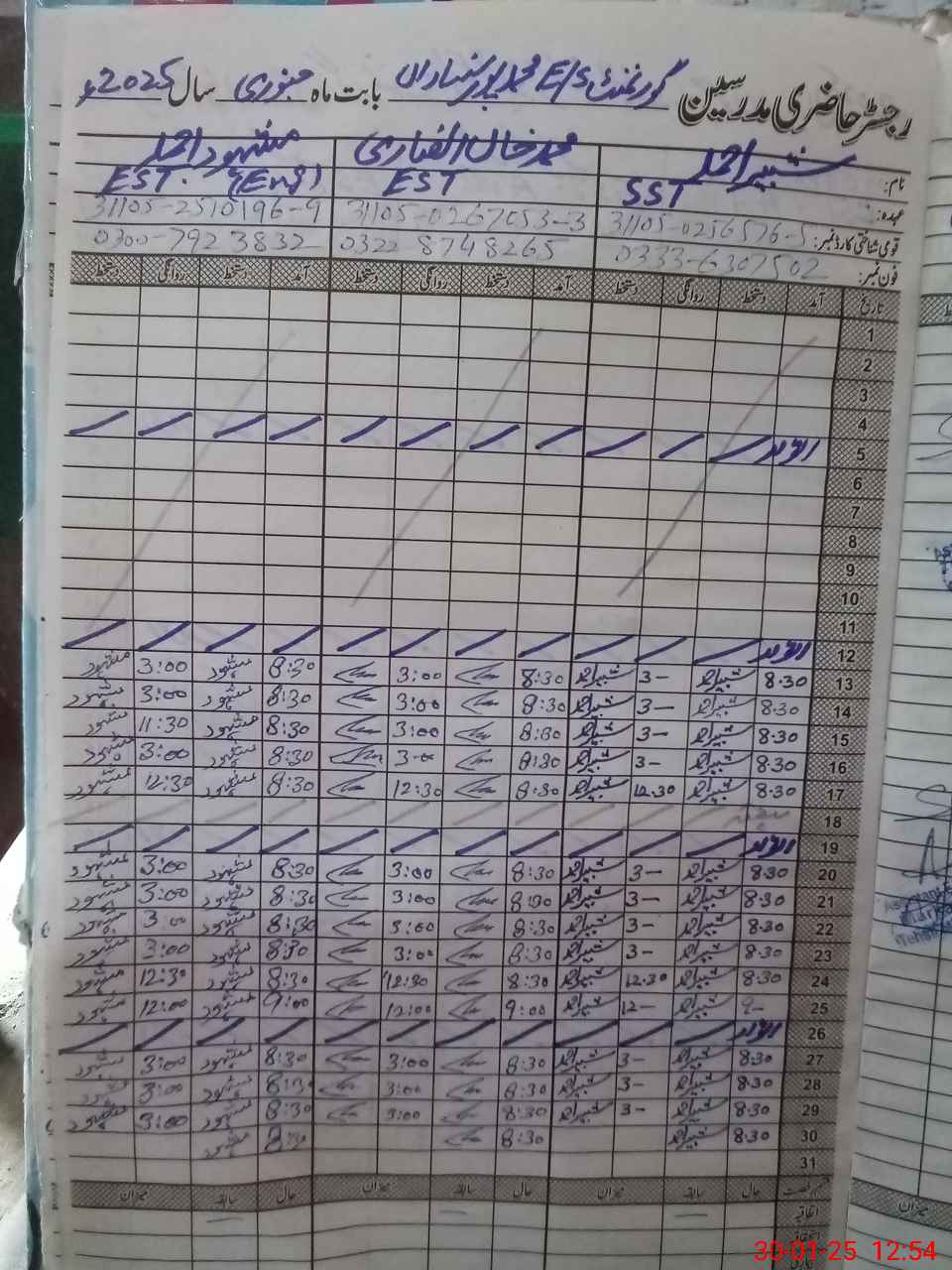 | CNIC | Full Name | Designation | R/C | Absence during last cal. month |
