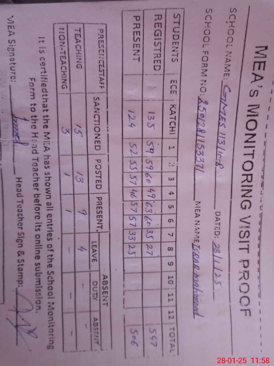 | Attendance Register | Head Teacher | MEA with School | Visit Proof |