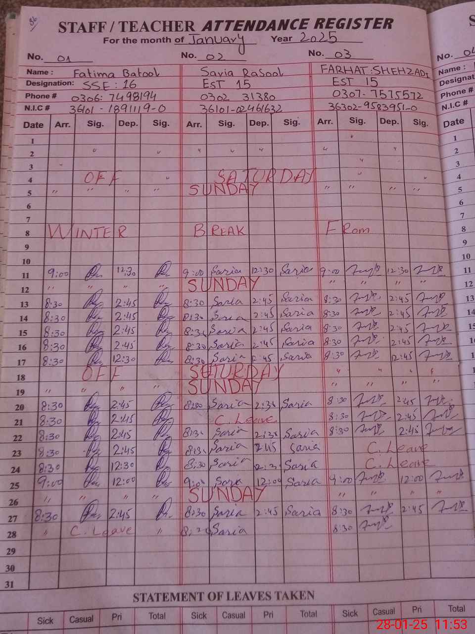 | CNIC | Full Name | Designation | R/C | Absence during last cal. month |
