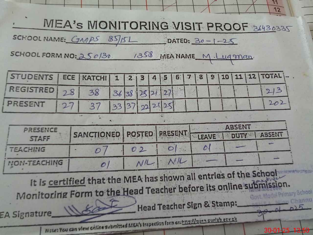 | Attendance Register | Head Teacher | MEA with School | Visit Proof |