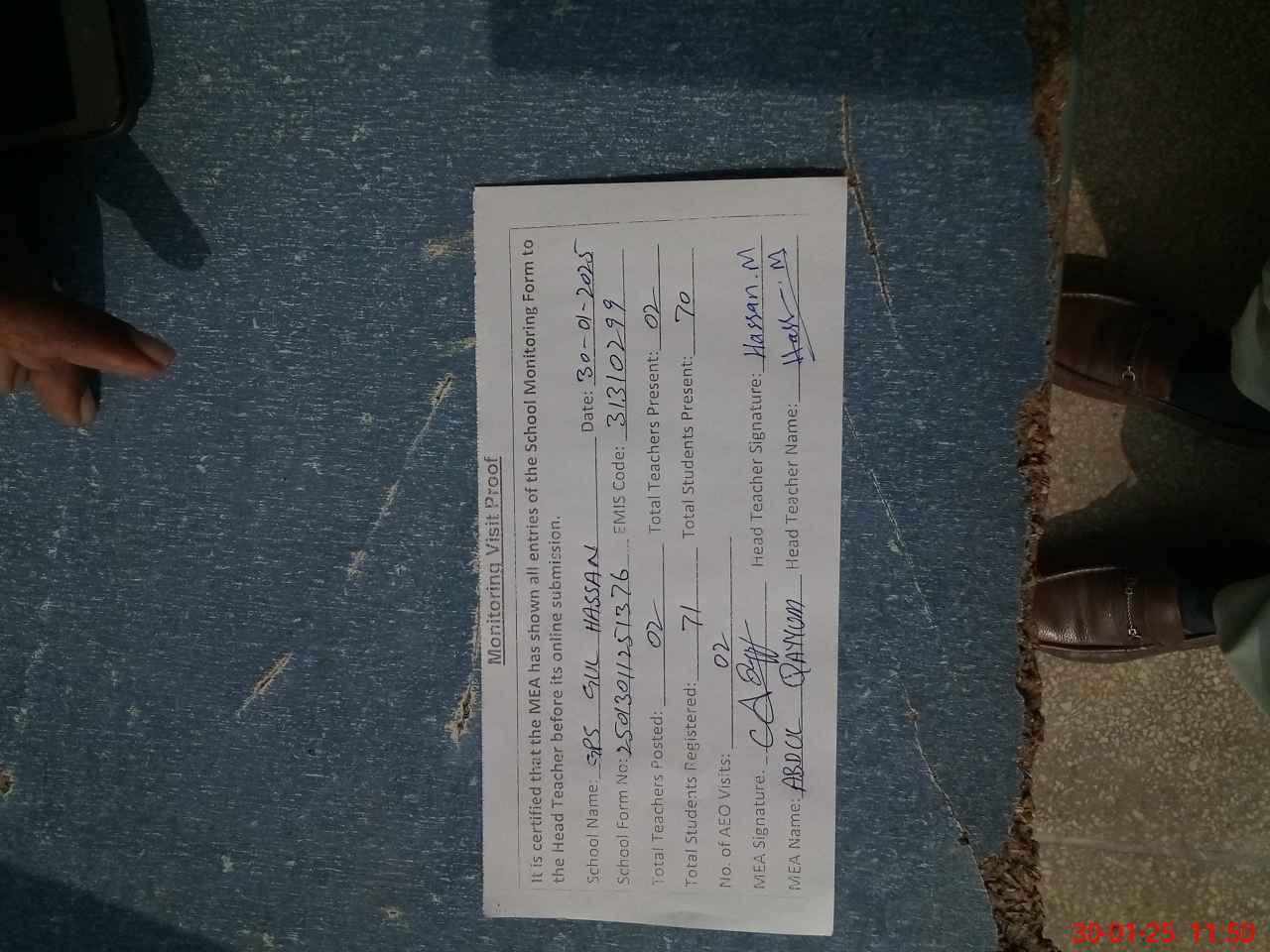| Attendance Register | Head Teacher | MEA with School | Visit Proof |