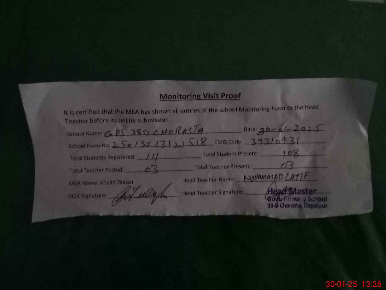 | Attendance Register | Head Teacher | MEA with School | Visit Proof |