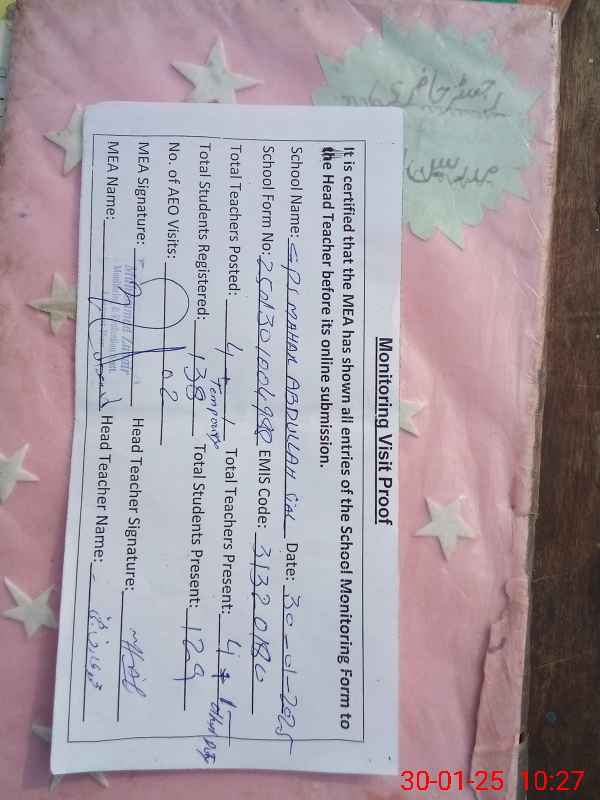 | Attendance Register | Head Teacher | MEA with School | Visit Proof |