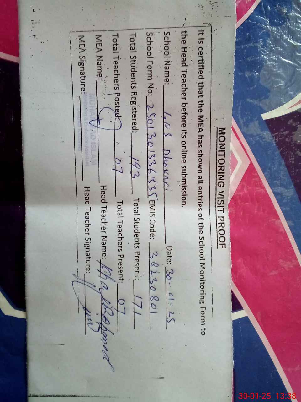 | Attendance Register | Head Teacher | MEA with School | Visit Proof |