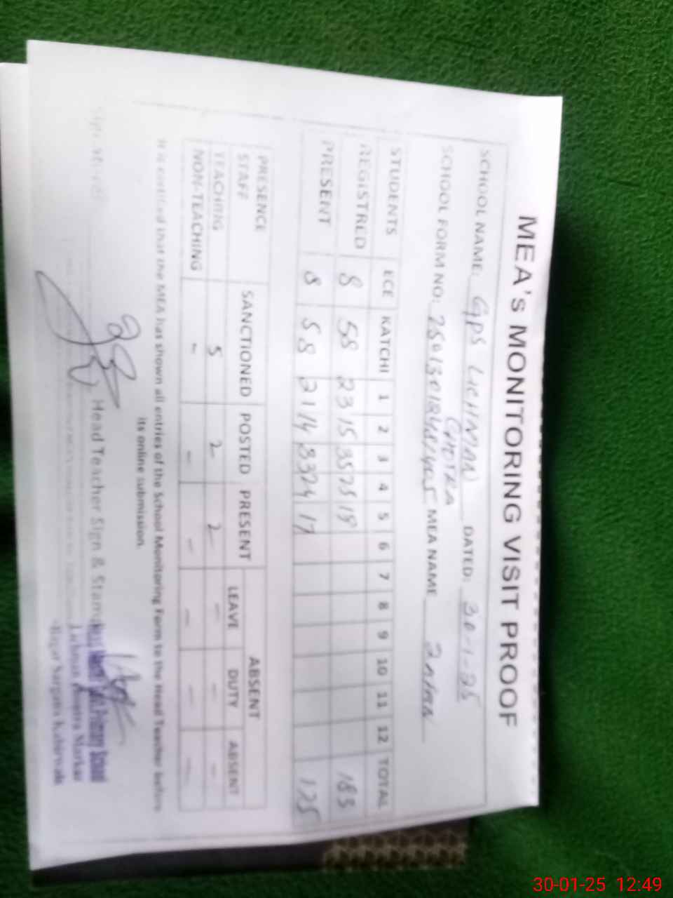 | Attendance Register | Head Teacher | MEA with School | Visit Proof |