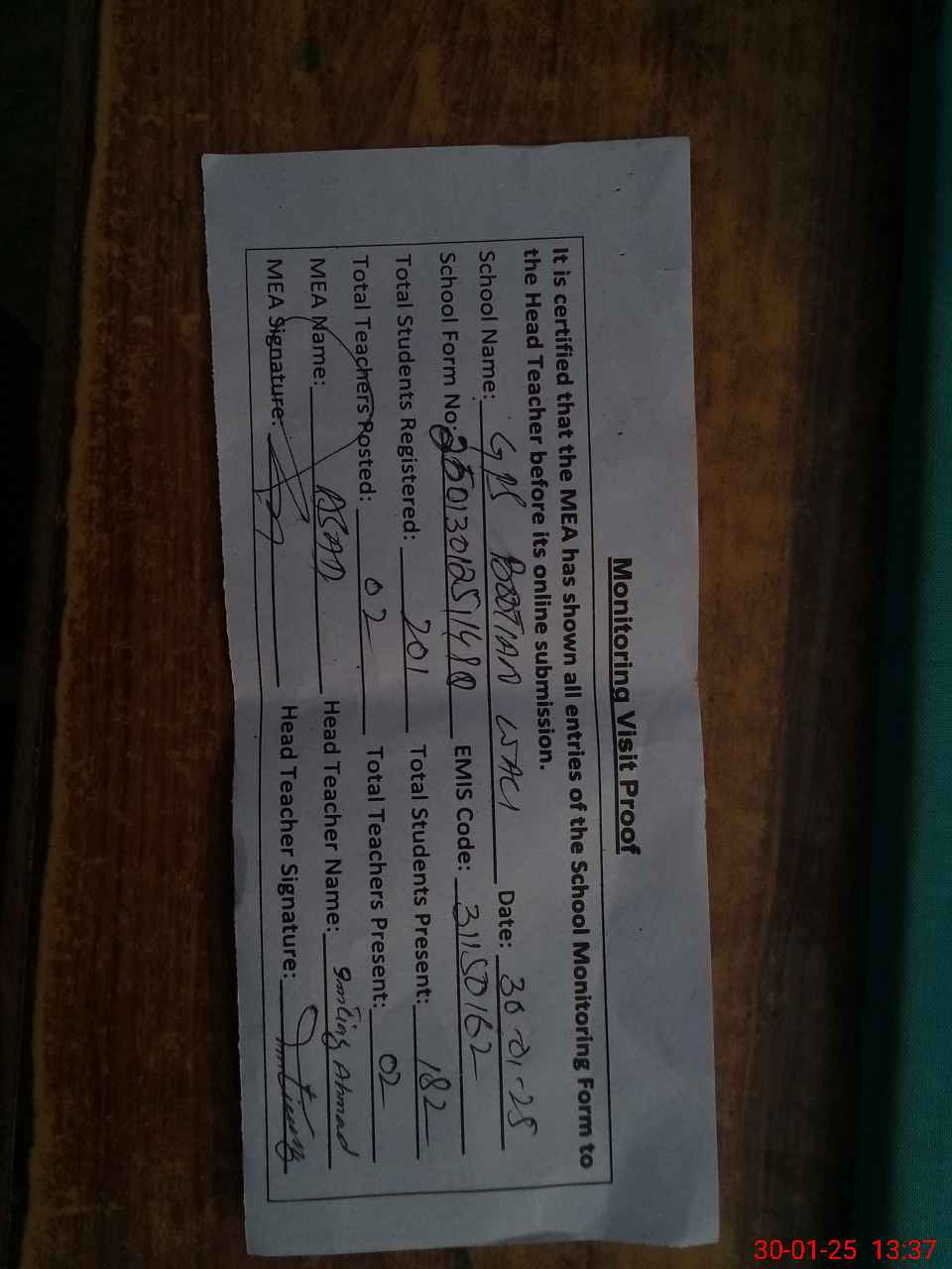 | Attendance Register | Head Teacher | MEA with School | Visit Proof |