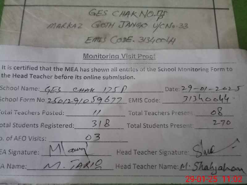 | EMIS Code: 31340044 | Name of School: GES CHAK NO 175/P | |||