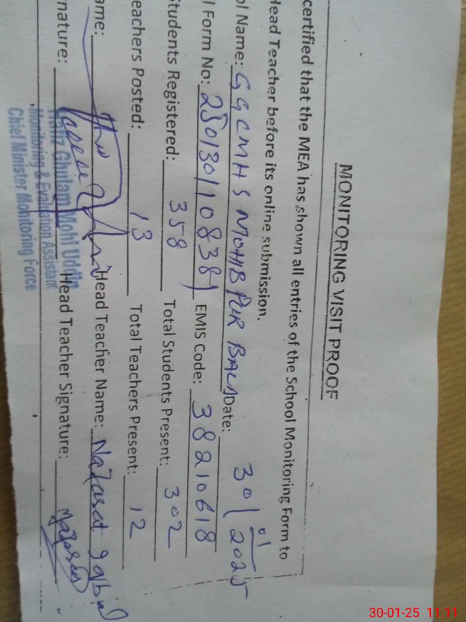 | EMIS Code: 38210618 | Name of School: GGCMHS MOHIB PUR BALA | |||