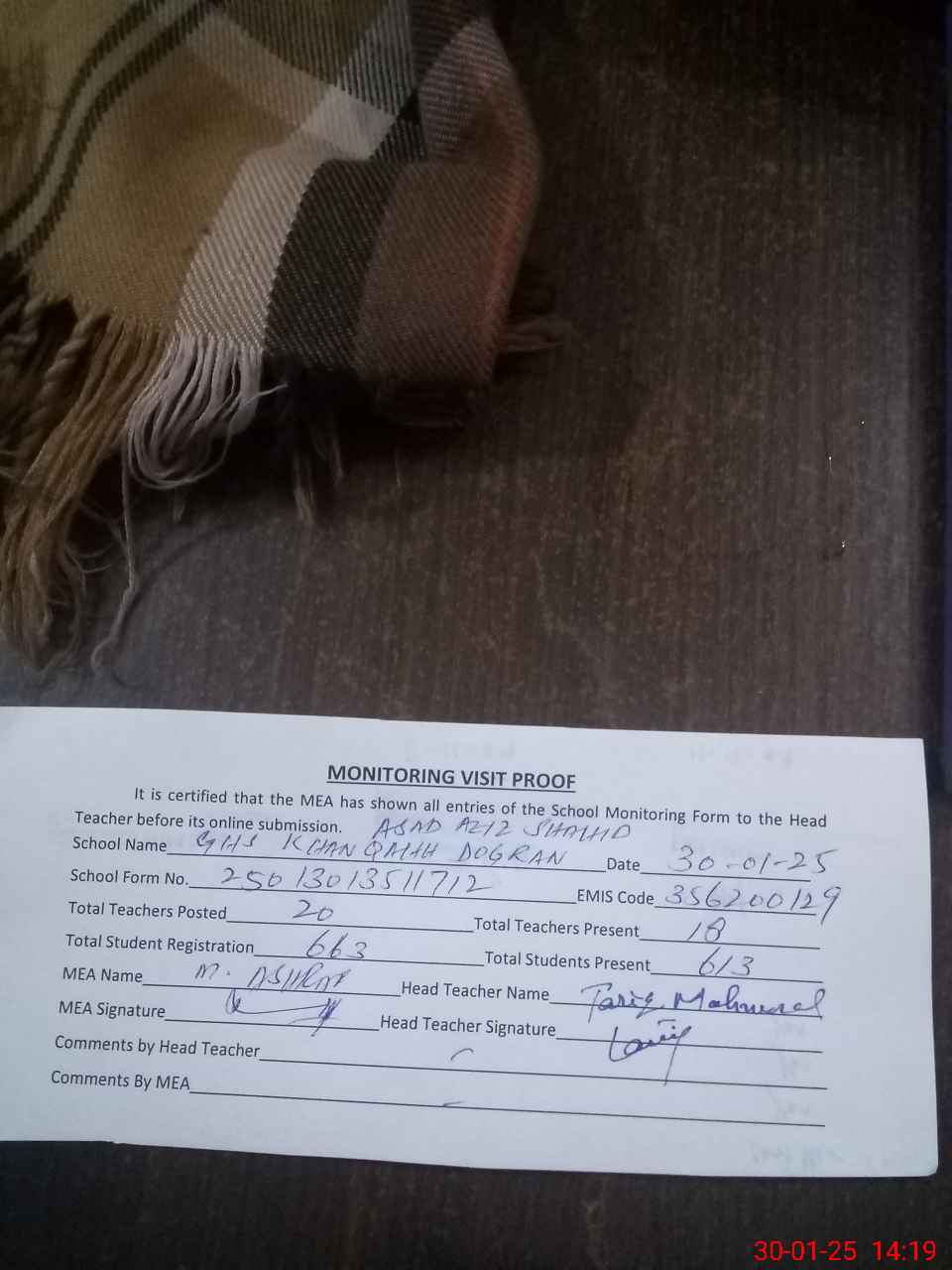 | Attendance Register | Head Teacher | MEA with School | Visit Proof |