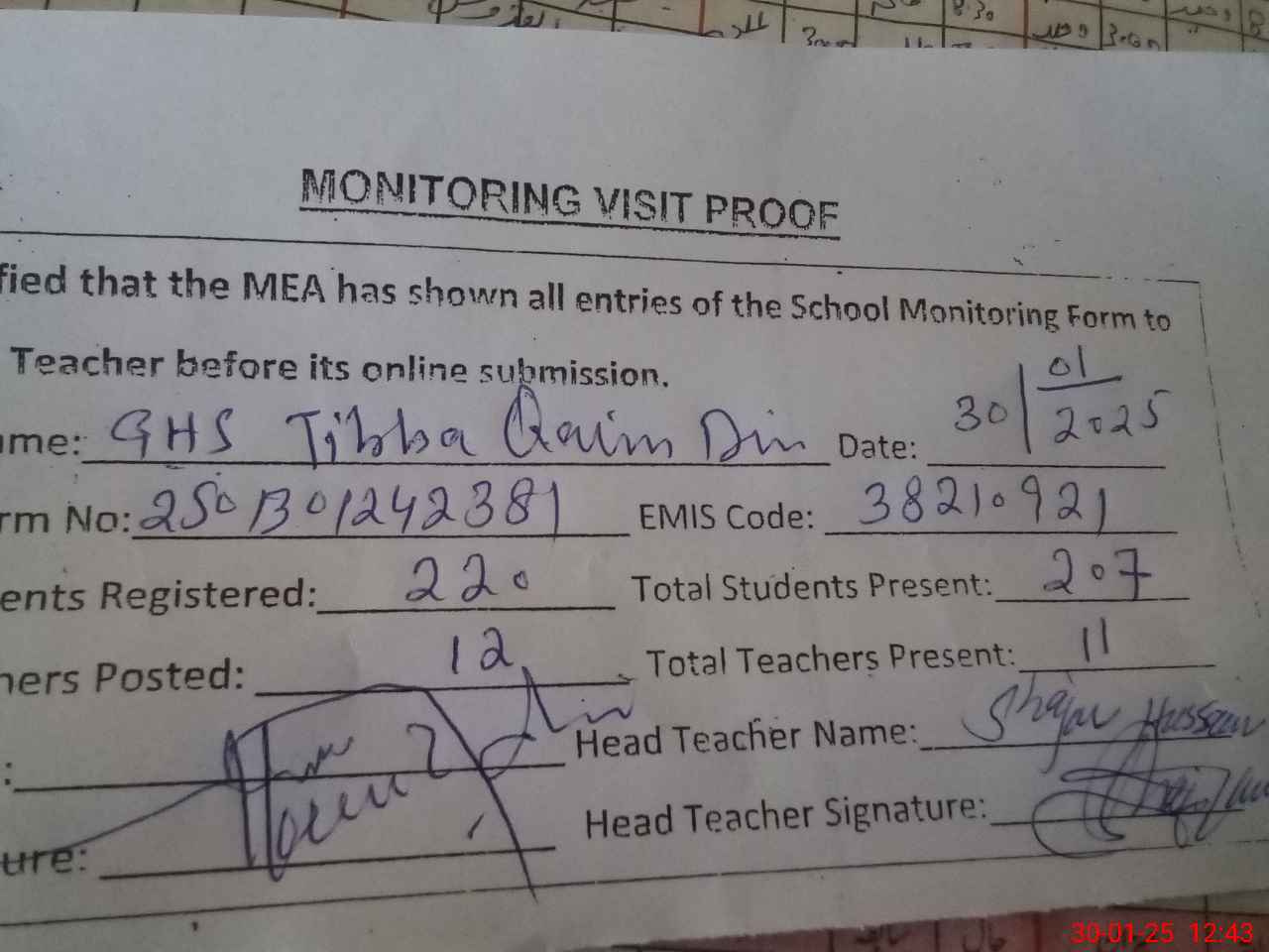 | Attendance Register | Head Teacher | MEA with School | Visit Proof |
