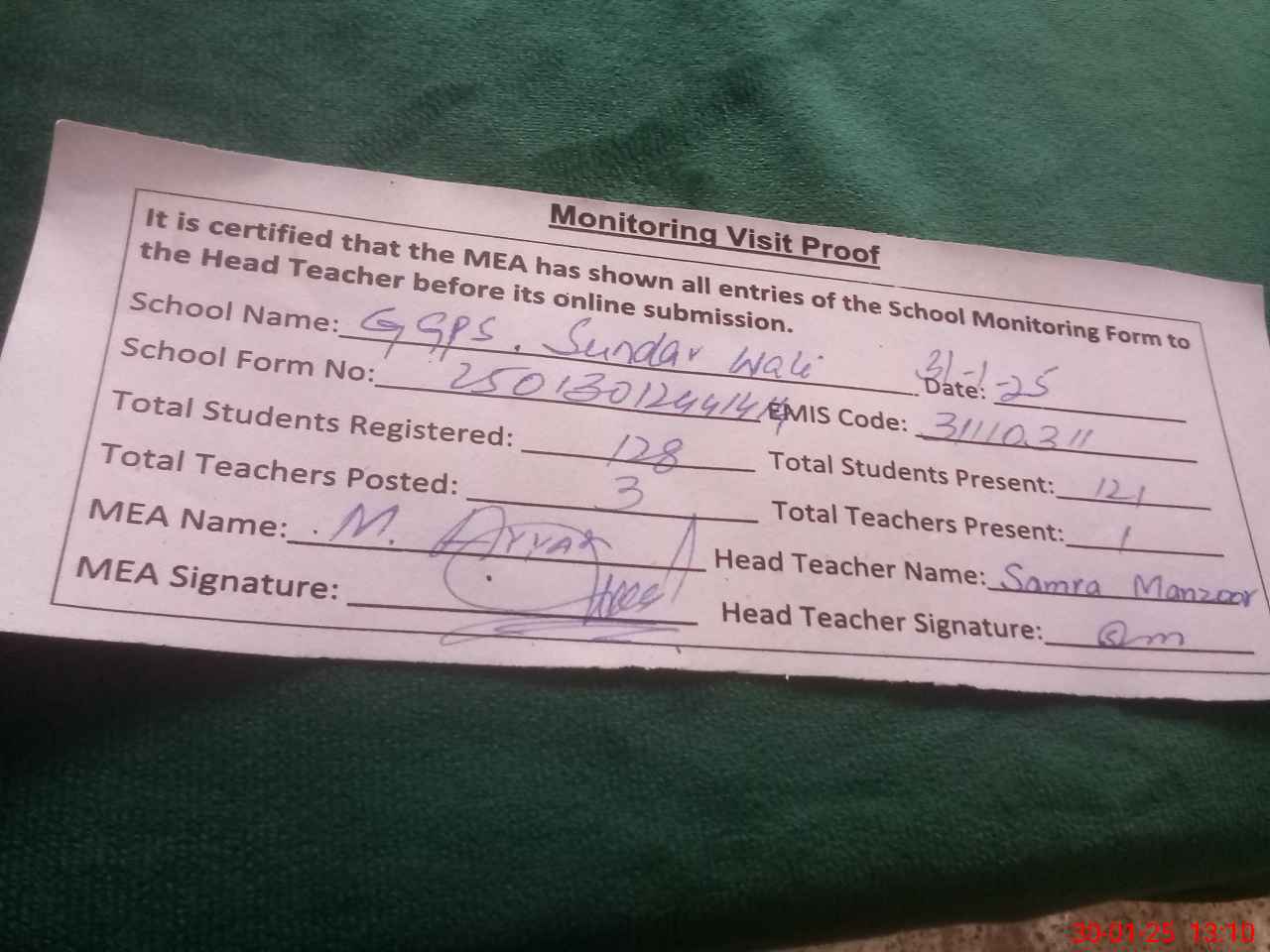 | Attendance Register | Head Teacher | MEA with School | Visit Proof |