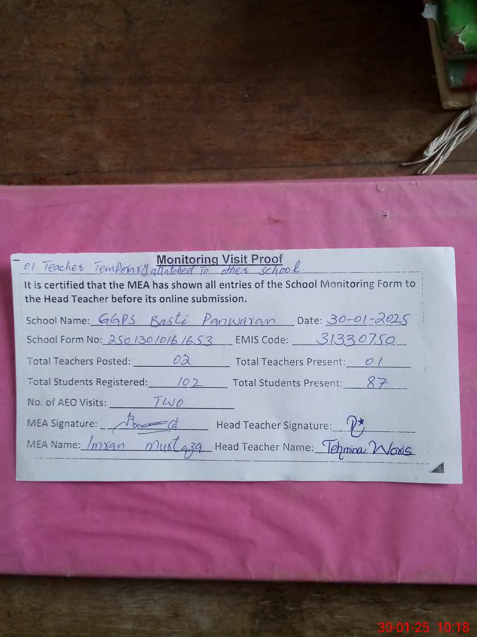 | EMIS Code: 31330750 | Name of School: GGPS BASTI PANWARAN | |||