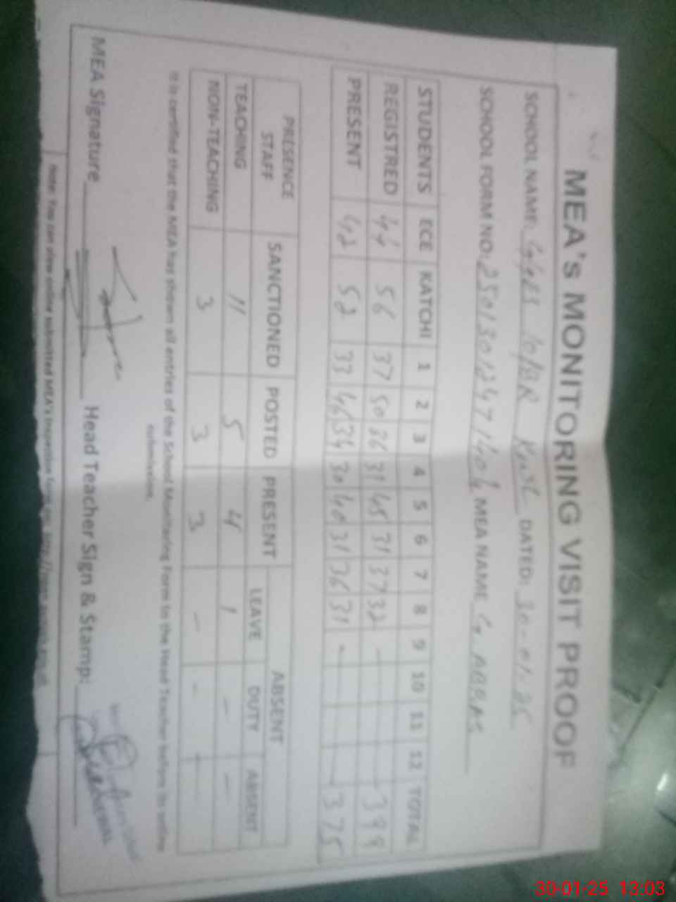 | Attendance Register | Head Teacher | MEA with School | Visit Proof |