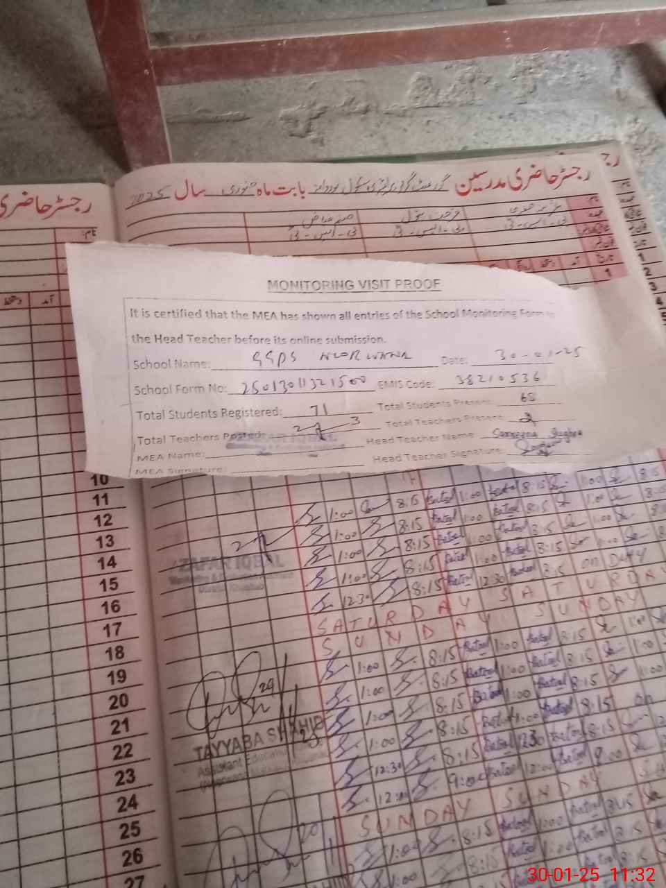 | Attendance Register | Head Teacher | MEA with School | Visit Proof |