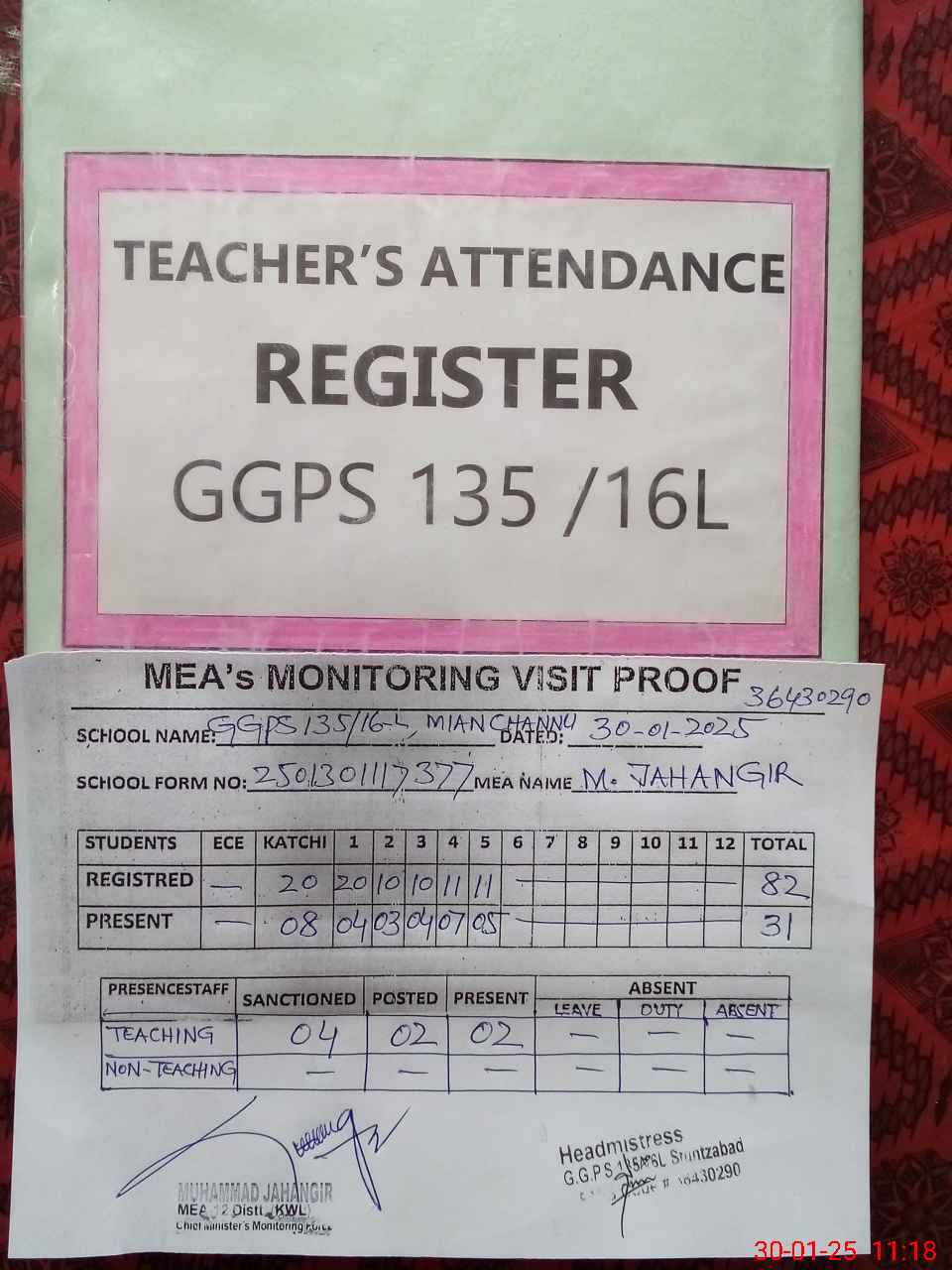 | EMIS Code: 36430290 | Name of School: GGPS 135/16-L, P/O 135/16-L STUNZABAD, MIAN CHANNU | |||