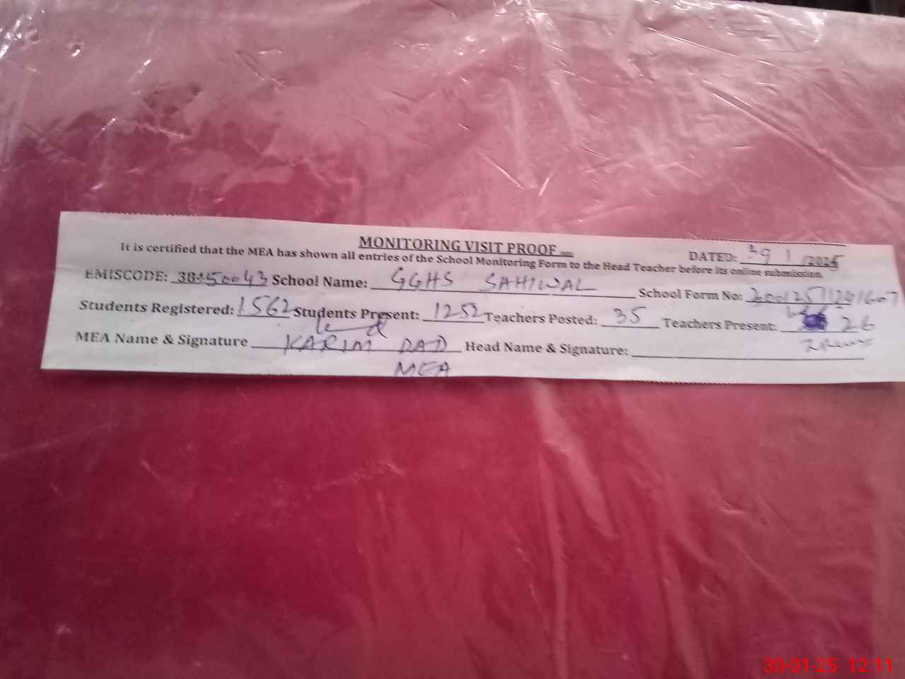 | EMIS Code: 38450043 | Name of School: GGHS SAHIWAL | |||