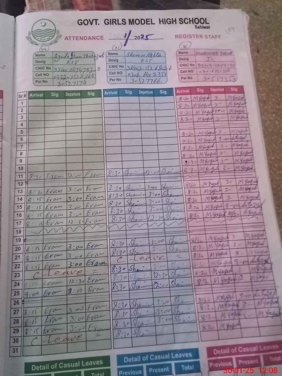 | CNIC | Full Name | Designation | R/C | Absence during last cal. month |