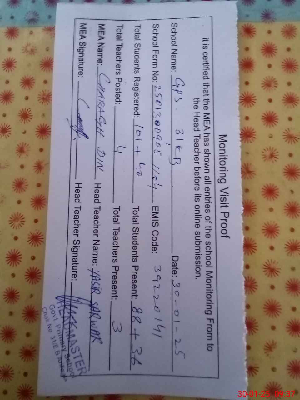 | Attendance Register | Head Teacher | MEA with School | Visit Proof |