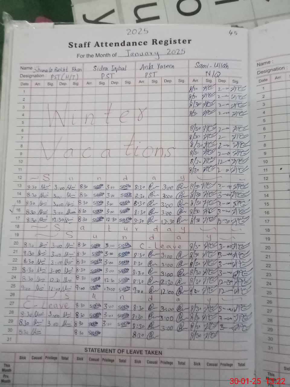 | Leave | Duty | Absent | Maternity | Medical | Ex- Pak |