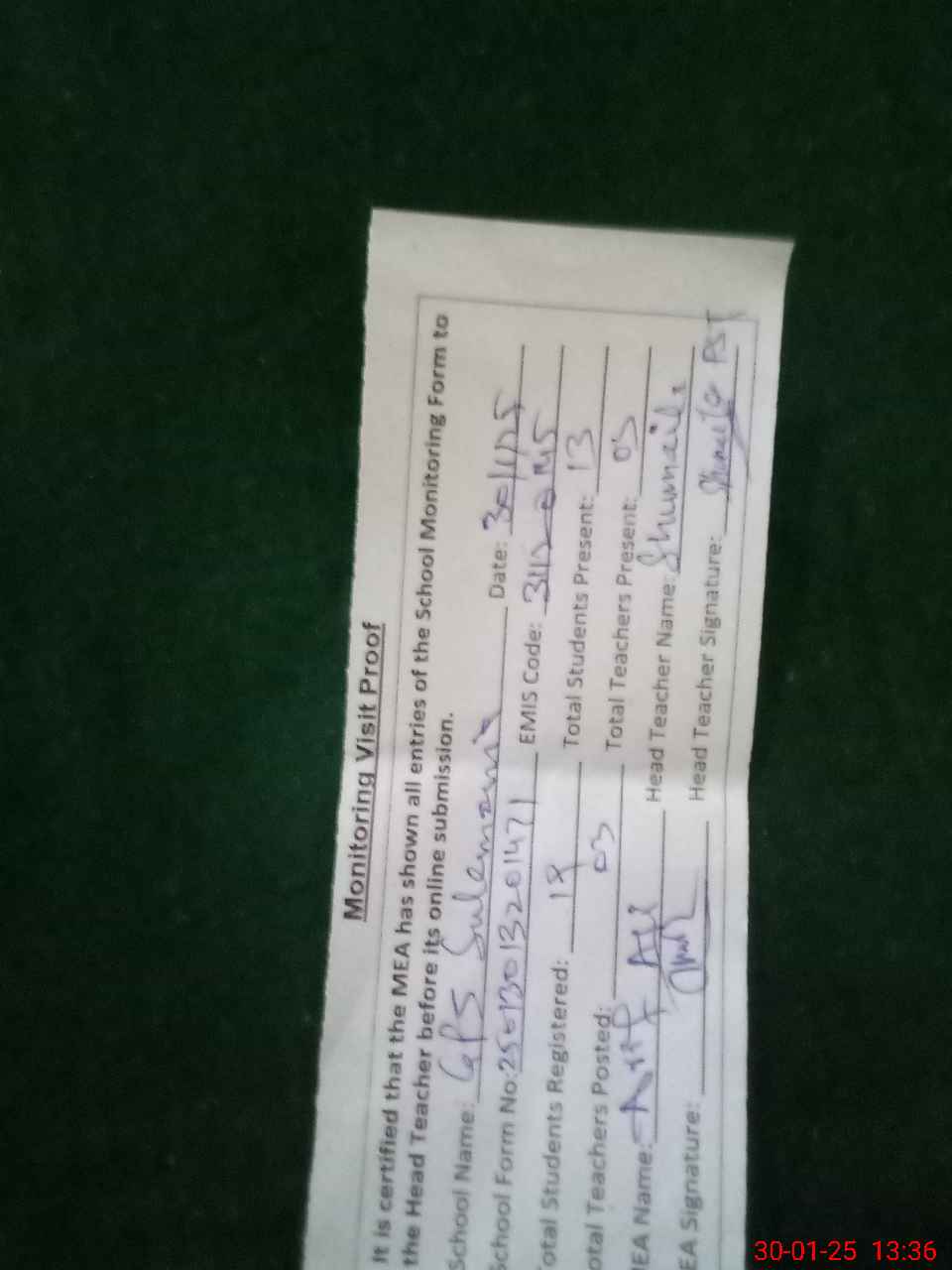 | Attendance Register | Head Teacher | MEA with School | Visit Proof |