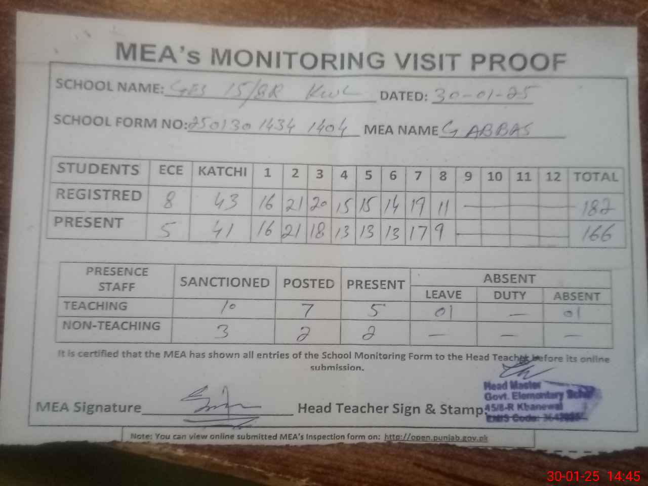 | Attendance Register | Head Teacher | MEA with School | Visit Proof |