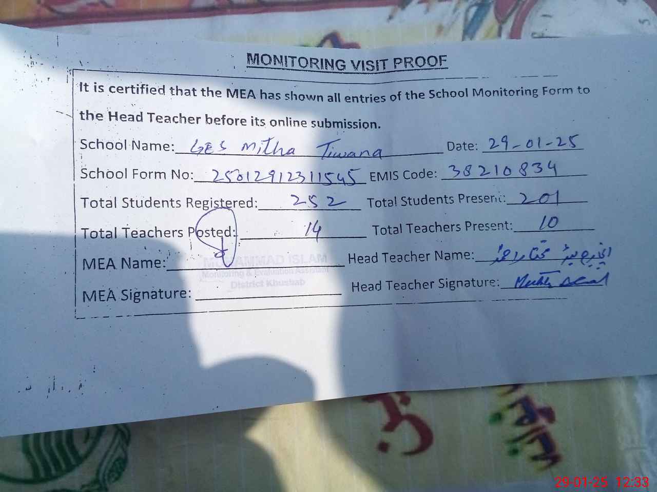 | District: KHUSHAB | Tehsil: KHUSHAB | Markaz: MITHA TIWANA (SADAR) (MALE) | Level: Middle | |