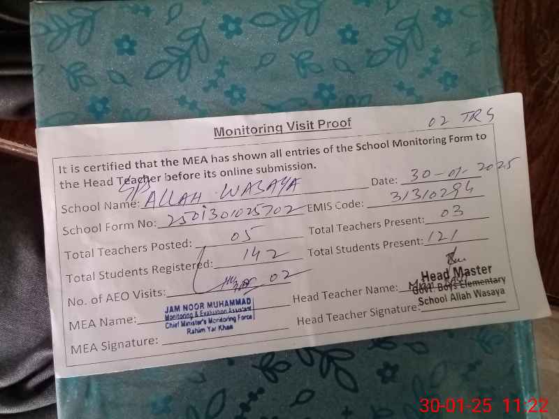 | EMIS Code: 31310294 | Name of School: GPS ALLAH WASAYA (After Noon) | |||