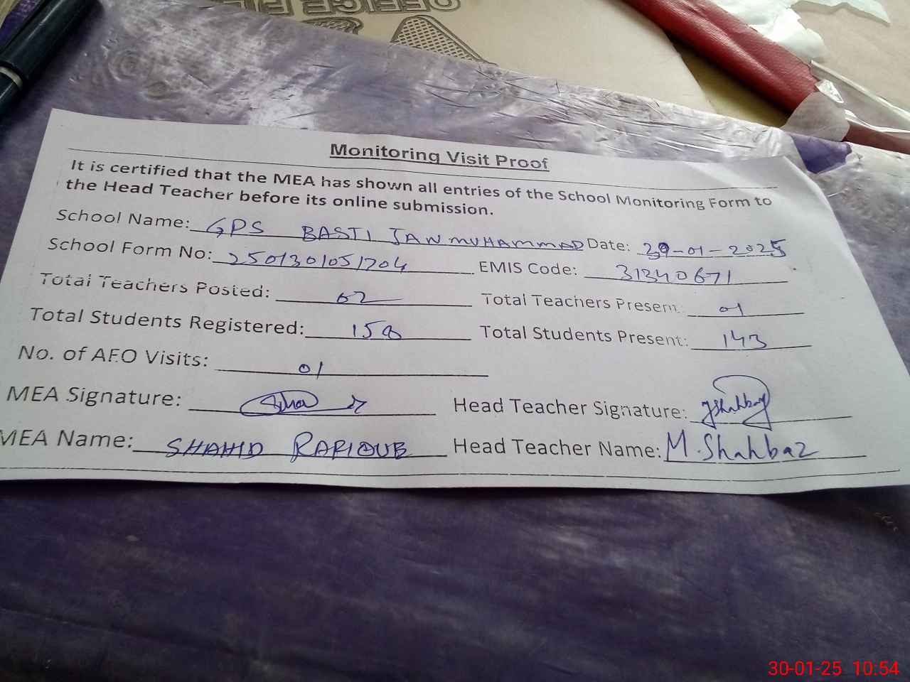 | Attendance Register | Head Teacher | MEA with School | Visit Proof |