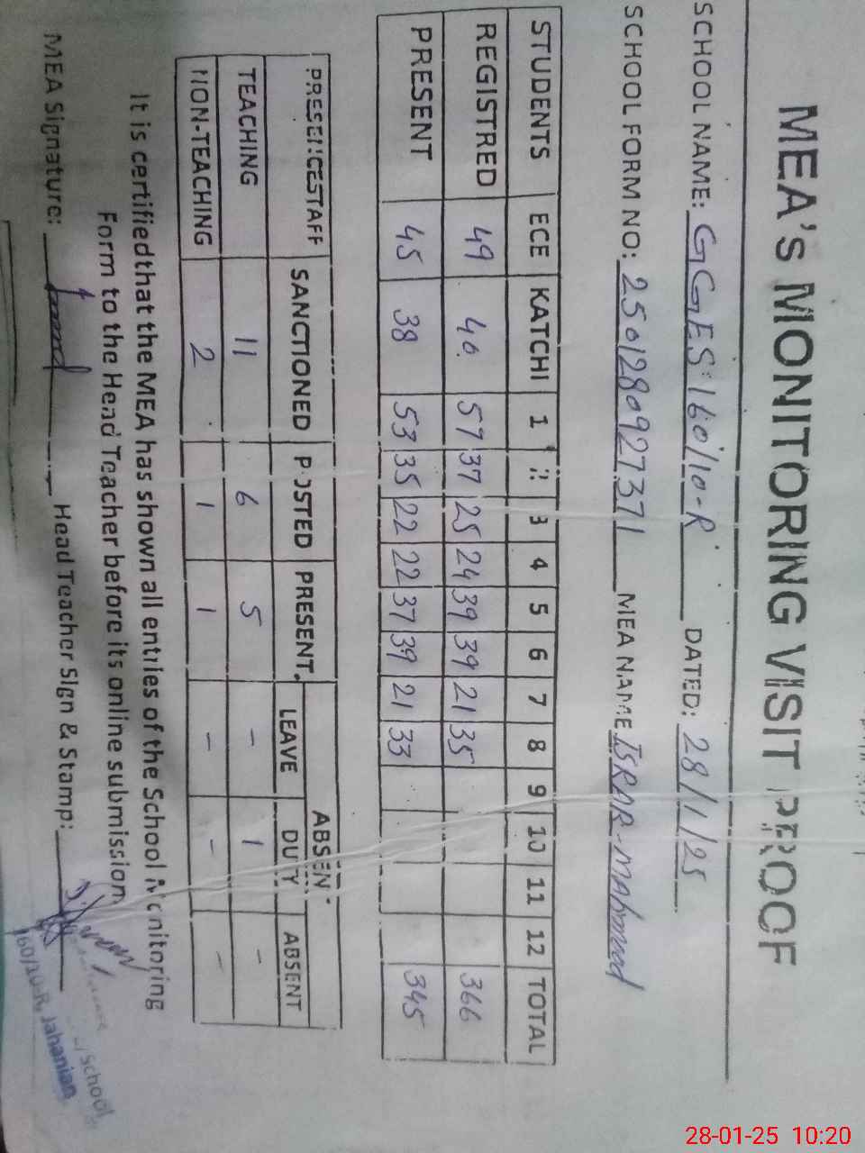 | Attendance Register | Head Teacher | MEA with School | Visit Proof |