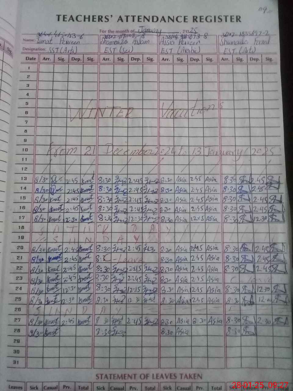 | Leave | Duty | Absent | Maternity | Medical | Ex- Pak |
