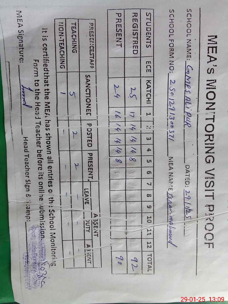 | Attendance Register | Head Teacher | MEA with School | Visit Proof |