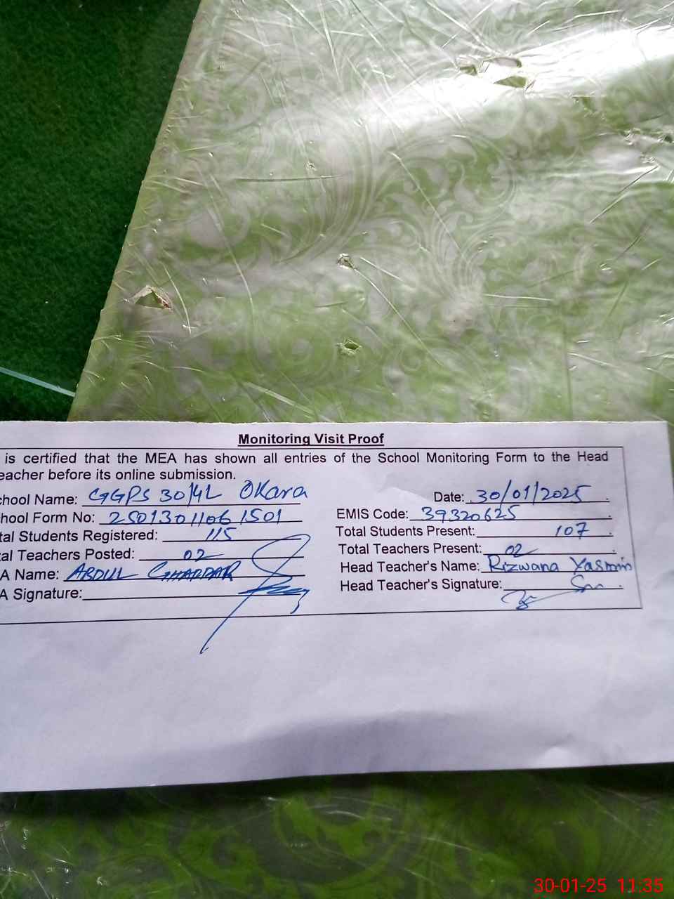 | Attendance Register | Head Teacher | MEA with School | Visit Proof |