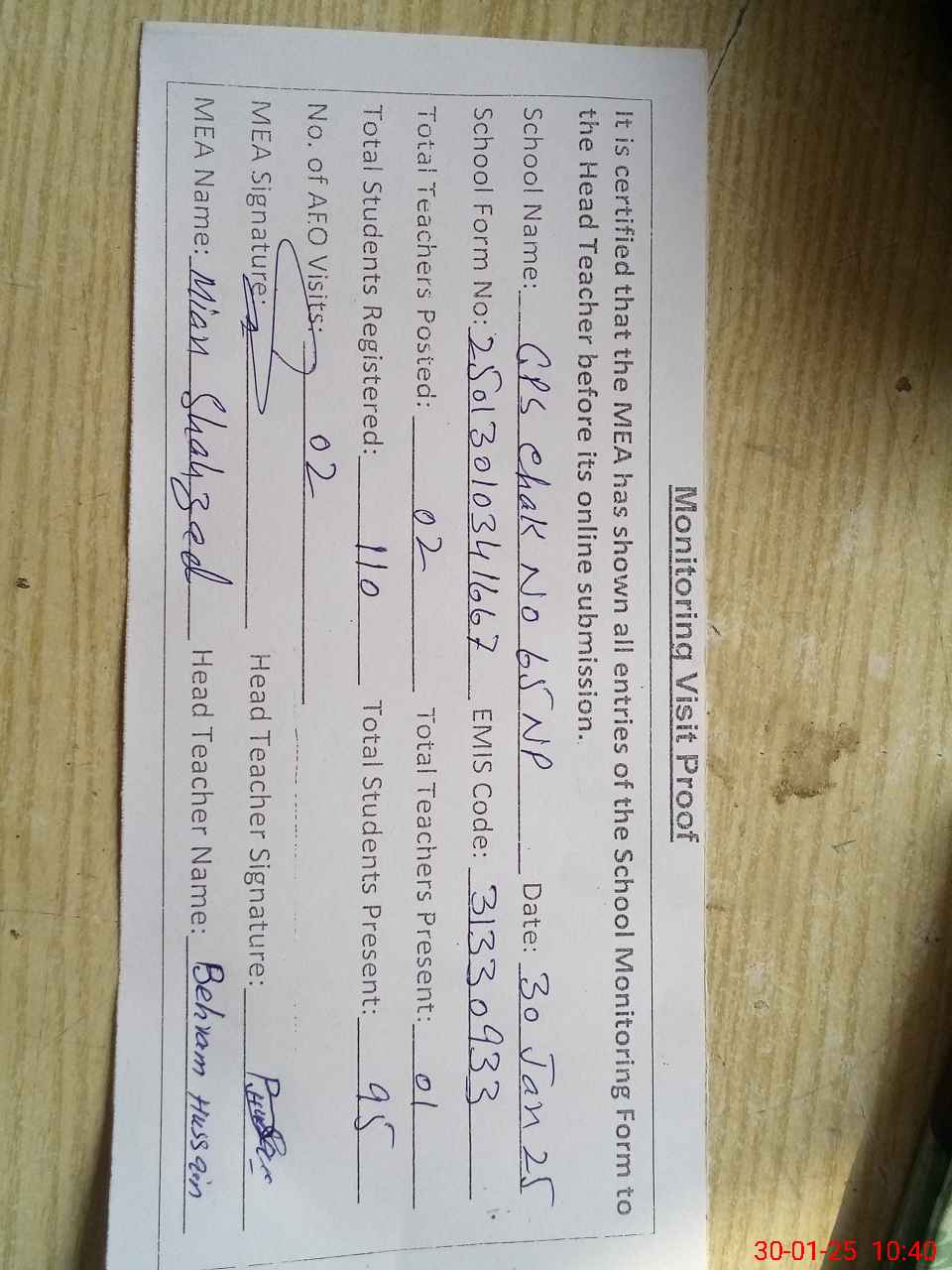 | Attendance Register | Head Teacher | MEA with School | Visit Proof |