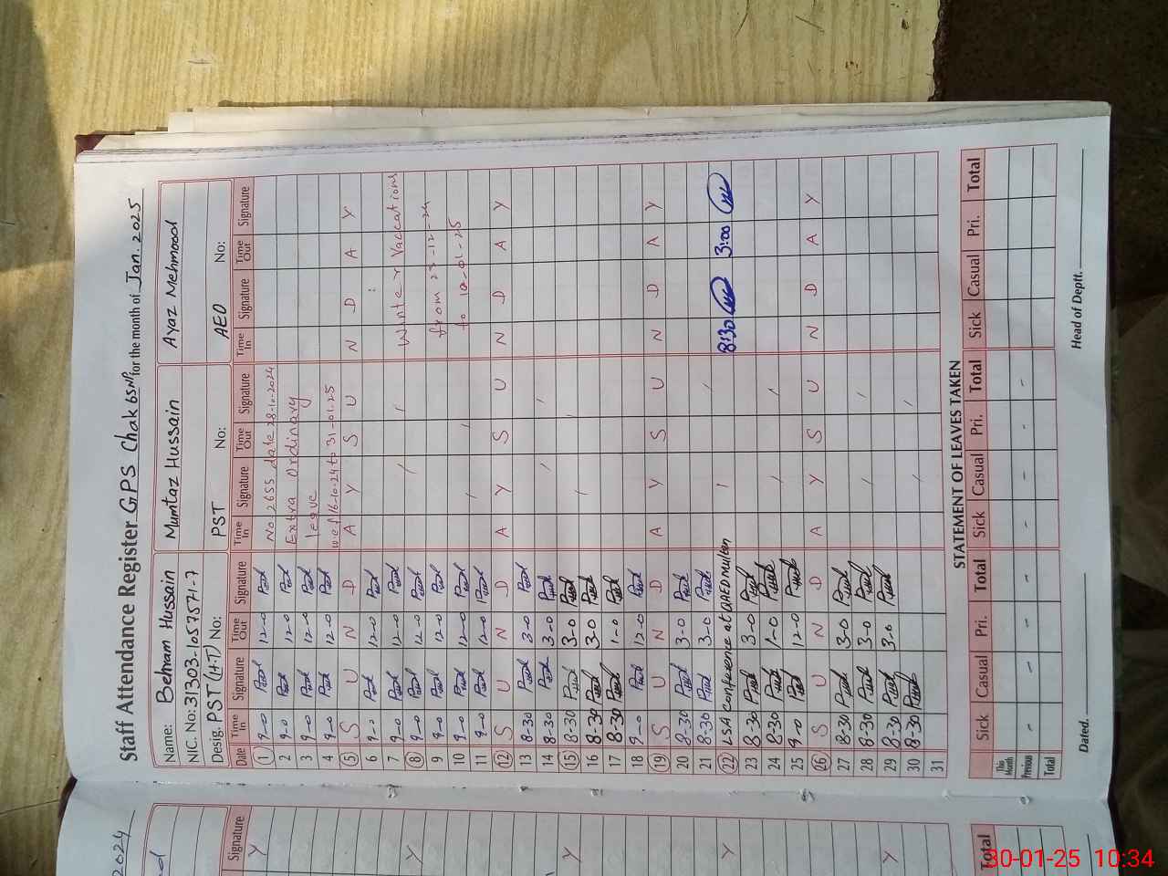 | CNIC | Full Name | Designation | R/C | Absence During Last Calender Month |