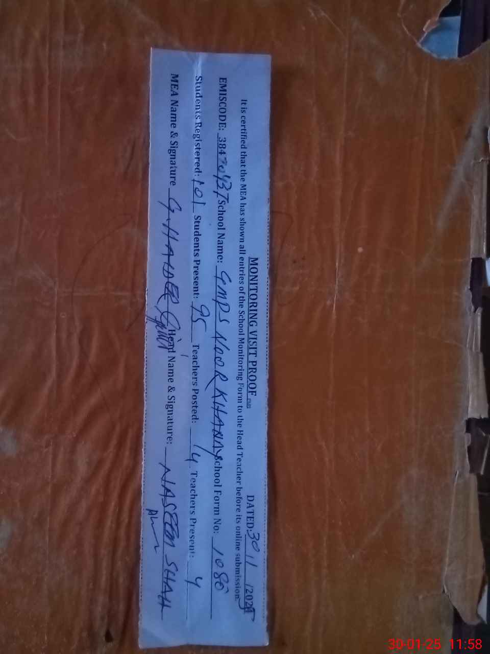 | Attendance Register | Head Teacher | MEA with School | Visit Proof |