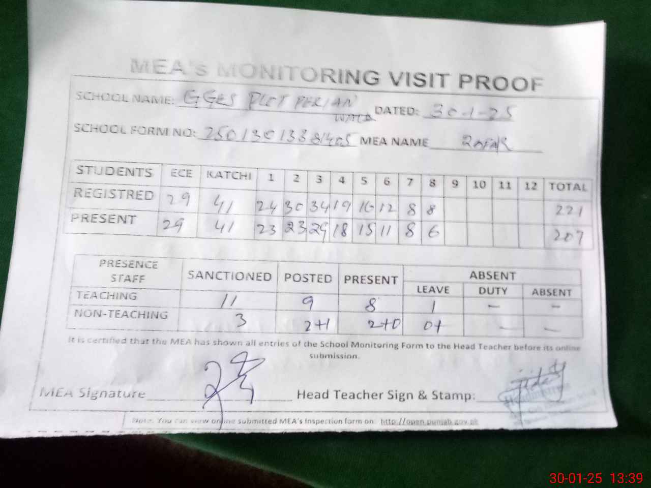 | Attendance Register | Head Teacher | MEA with School | Visit Proof |