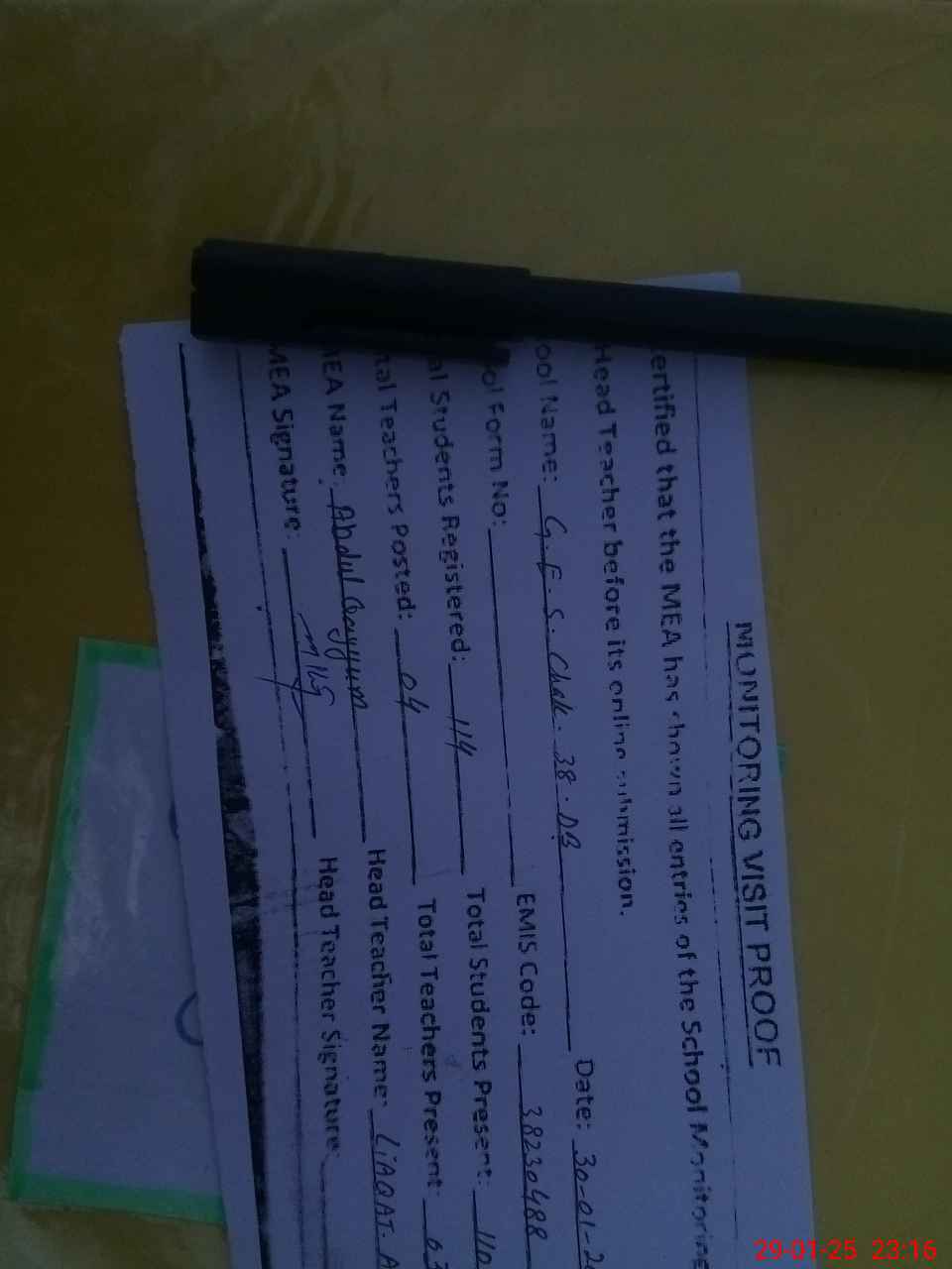 | Attendance Register | Head Teacher | MEA with School | Visit Proof |