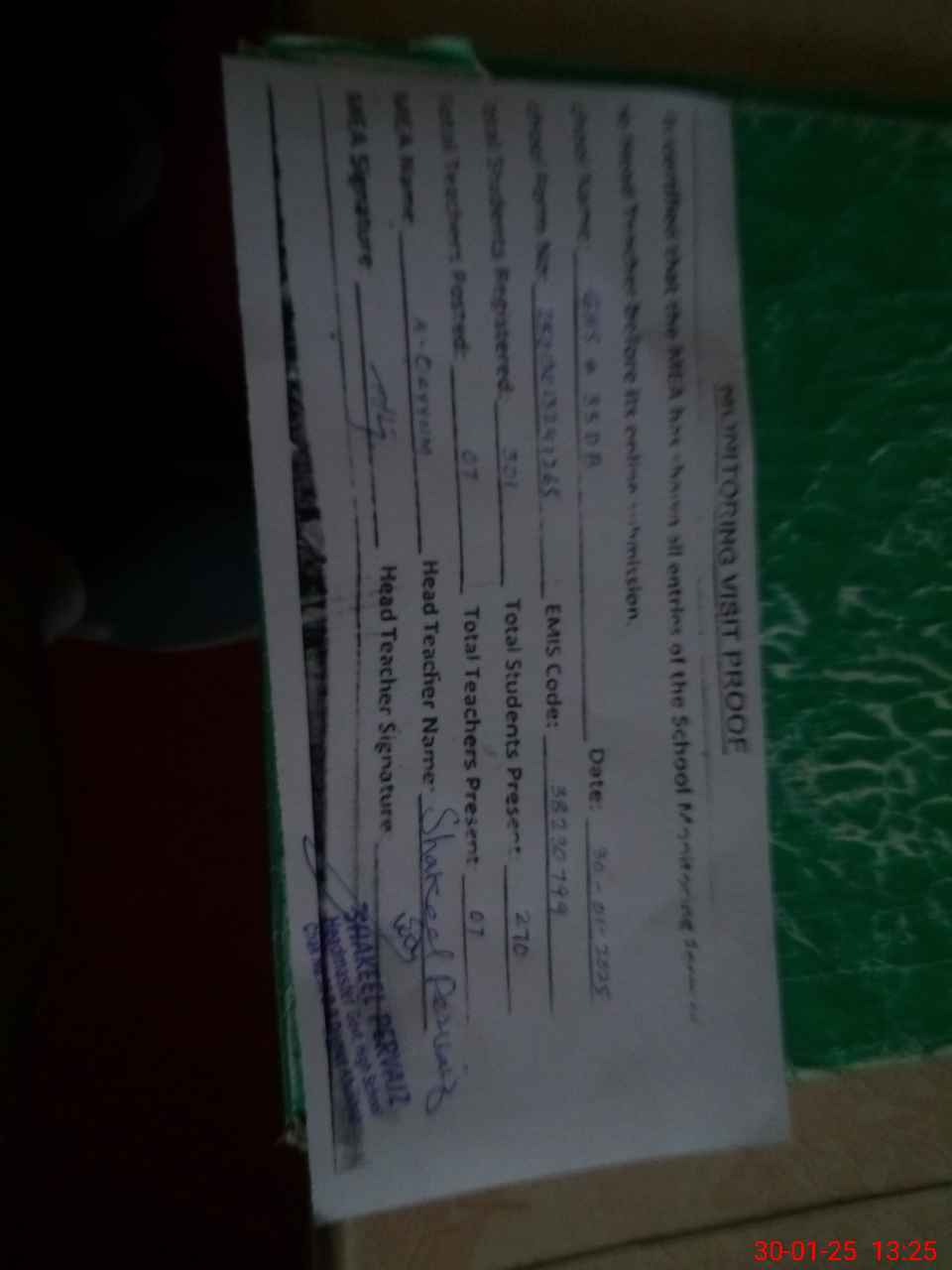 | Attendance Register | Head Teacher | MEA with School | Visit Proof |