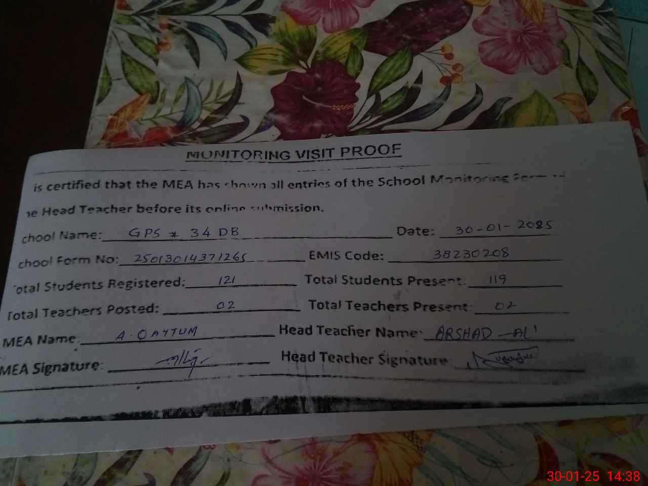 | EMIS Code: 38230208 | Name of School: GPS CHAK NO. 34/DB | |||