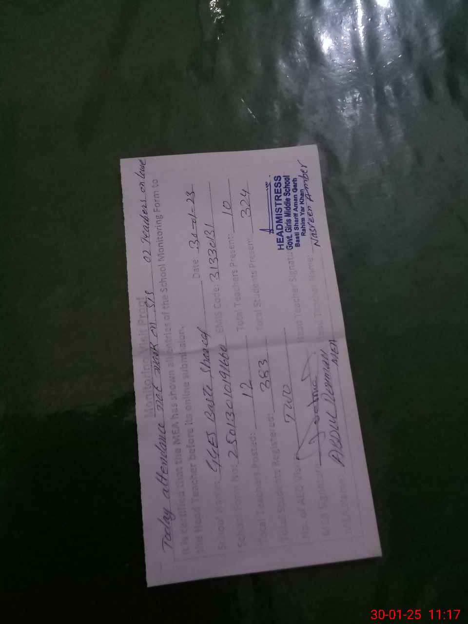 | Attendance Register | Head Teacher | MEA with School | Visit Proof |