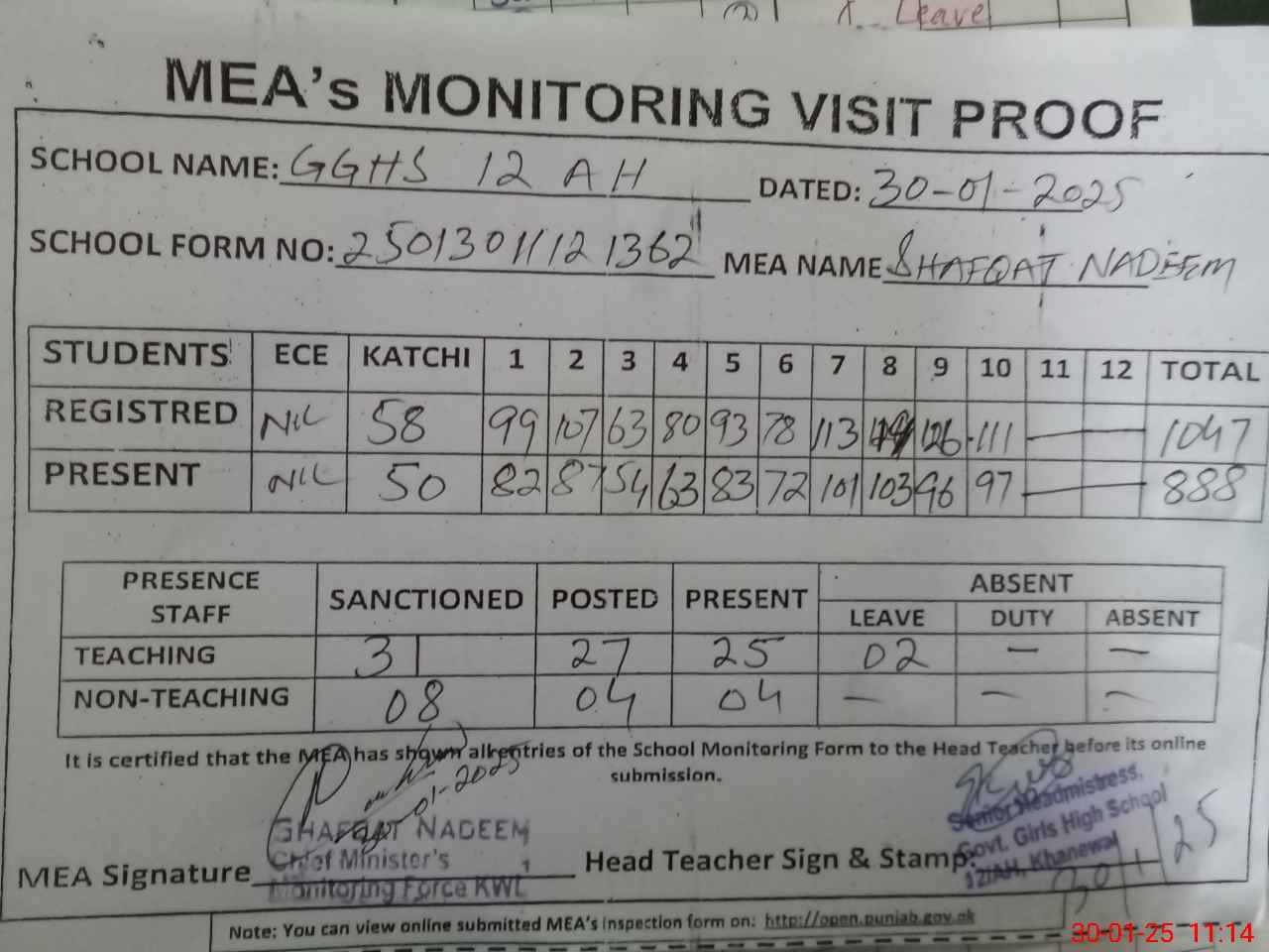 | EMIS Code: 36420046 | Name of School: GGHS 12/AH, KHANEWAL | |||